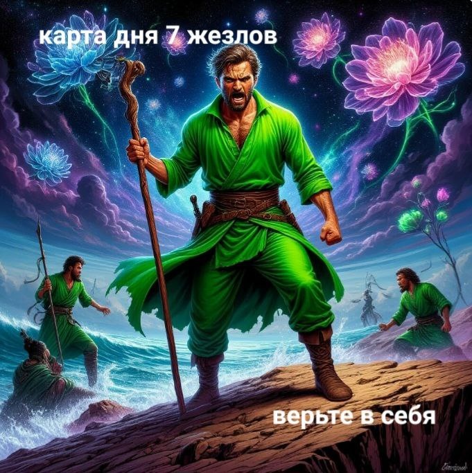 Карта дня 7 жезлов Активный, позитивный день. Но будьте внимательны, возможны препятствия или выяснения, кто прав. В этот день важно крепко стоять на ногах и всё получится.