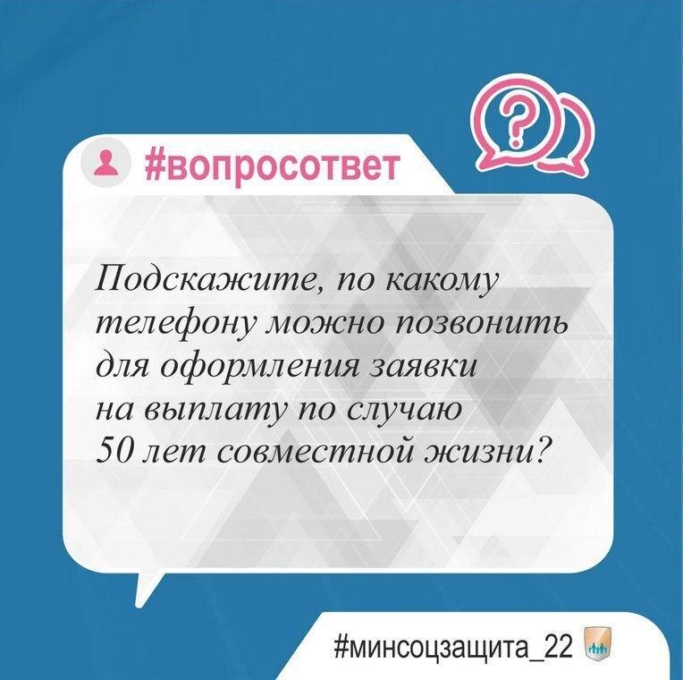 ❔Здравствуйте. Подскажите, по какому телефону можно позвонить для оформления заявки на выплату по случаю 50 лет совместной жизни? 💭Здравствуйте. Вы можете подать заявление на предоставление Единовременного денежного поощрения супругам, отметившим 50-летие совместной жизни в любом филиале МФЦ, управлении социальной защиты населения (УСЗН) по месту жительства или подать заявку в УСЗН и оформить заявление на дому. ✅Адреса и контактные данные управлений социальной защиты указаны на нашем официальном сайте https://clck.ru/QsDC9 *Вопрос поступил черед систему "Инцидент менеджмент" #Алтайскийкрай #Минсоцзащита_22 #Вопросответ