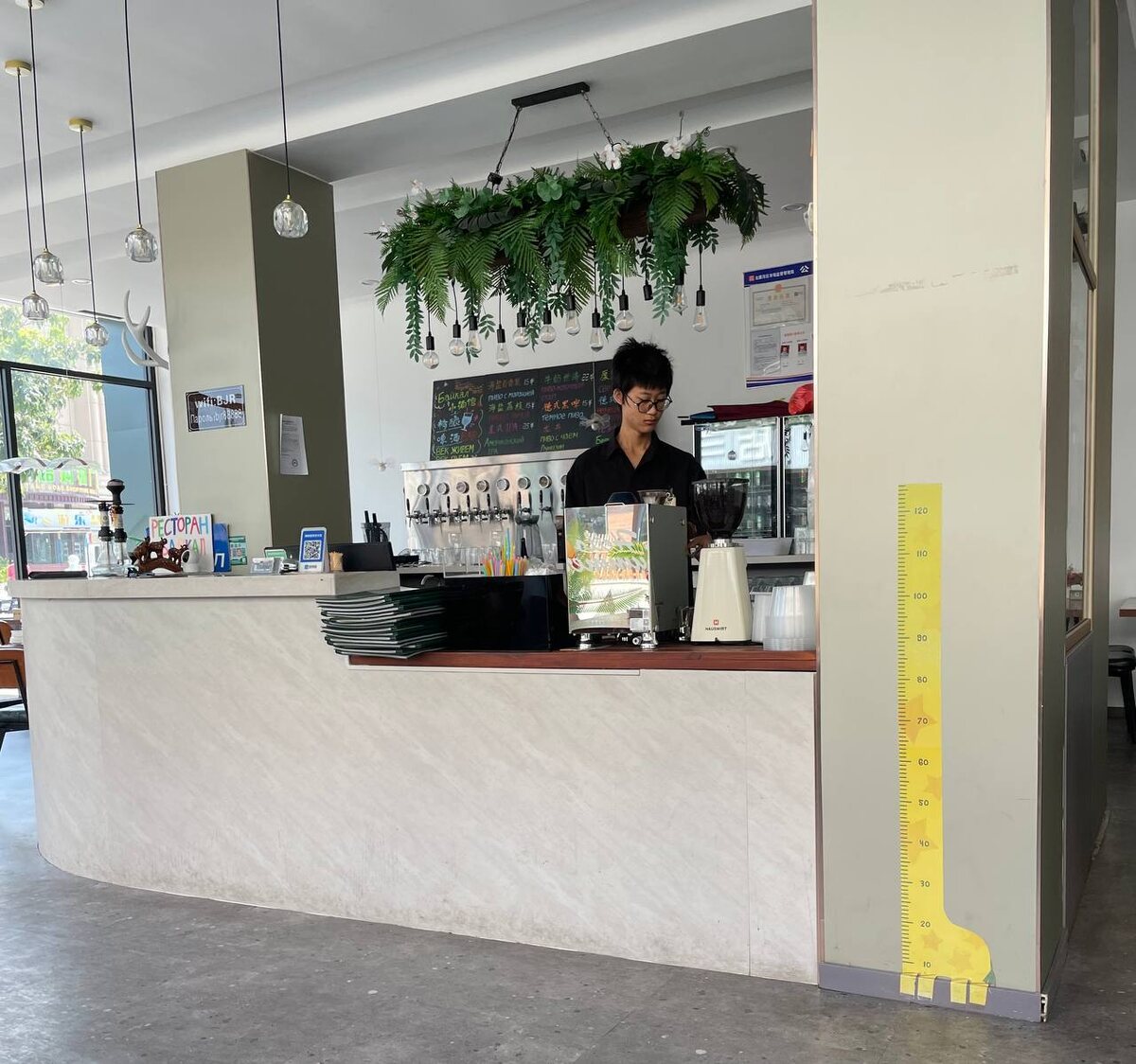 Когда готовит кофе китайский Гарри Поттер. И да, почему можно увидеть ростомер в любом ресторане или прочем увеселении: дети до 120 см ростом или бесплатно, или значительная скидка. Выше 120 см: или скидка поменьше, или полная стоимость