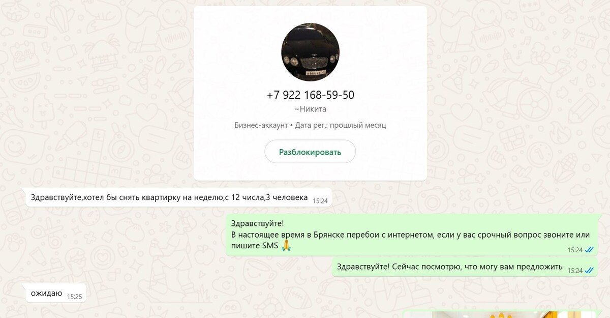 Раз в год обязательно появляется какая-то очередная схема и идет по всем посуточникам. Буквально неделю назад читала у коллеги в канале, вера до меня докатилось. Вам напрямую (через WhatsApp, Telegram) приходит запрос на жирную бронь: Далее я высылаю условия и вообще всё нравится без вопросов: То есть смотрите: И В целом чек выглядит очень правдоподобно! НО! У вас на счету не будет их! И После того, как я написала, что деньги не пришли, мошенники даже не пытались оправдаться. Со мной всё ясно - не прокатит. Если б я была невнимательна и не проверила банк, то через пару дней "гость" сказал, что, к сожалению, они не смогут приехать - верните предоплату. Невнимательные хосты в целом могут так поступить. У нас в Брянске, конечно, за косарь не жалко. Но в крупных городах, где часто берут предоплату вообще полную стоимость - сумма весомая. А вот и подтверждение мошенничества от моих коллег: Ну и дублирую номер гадов, чтобы пробивался по поиску: +7 922 168 59 50 и второй 995 675-23-61.