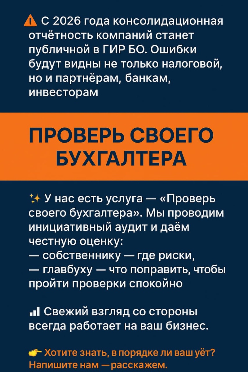📢 С 1 сентября 2025 года у аудиторов новая обязанность — публиковать в ГИР БО итоги проверок консолидированной отчетности. 😢 Раньше там была только годовая отчётность, а теперь любой сможет увидеть реальное финансовое состояние компании. 🙈Для бизнеса это значит одно: прозрачность и доверие будут напрямую зависеть от качества учёта. ⚠️ Впервые документы придётся сдавать в 2026 году — по отчётности за 2025-й. 🥁 Ошибки или «серая зона» теперь будут видны не только налоговой, но и вашим партнёрам, банкам, инвесторам. 💡 Поэтому мы в «Ваш ПрофБух» готовим компании так, чтобы отчётность работала на вас: — корректна и без штрафных рисков, — укрепляет доверие к бизнесу, — повышает инвестиционную привлекательность. ✨ Отдельно у нас есть услуга — «Проверь своего бухгалтера». 🔥🔥🔥Мы можем провести инициативный аудит и дать подробные рекомендации: — собственнику бизнеса — какие зоны риска есть в учёте, — главному бухгалтеру — на что обратить внимание, чтобы избежать претензий при пров