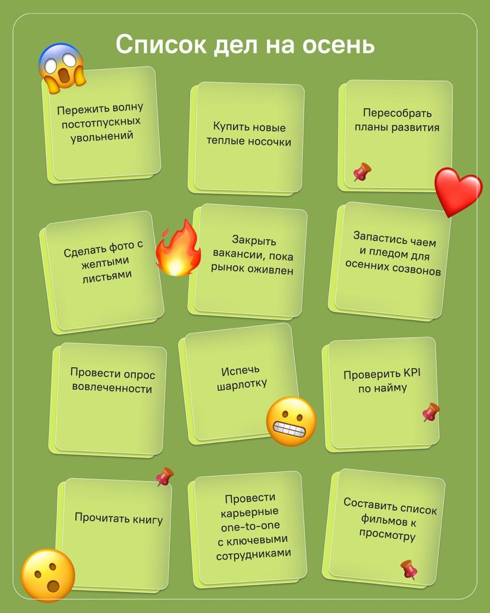 🗣Список HR-дел на осень Надеемся, вы запаслись витамином D и готовы к пасмурным дням. А если план на осень ещё не составлен — забирайте готовый! Мы включили и рабочие дела, и личные, чтобы не забыть про work-life balance💚