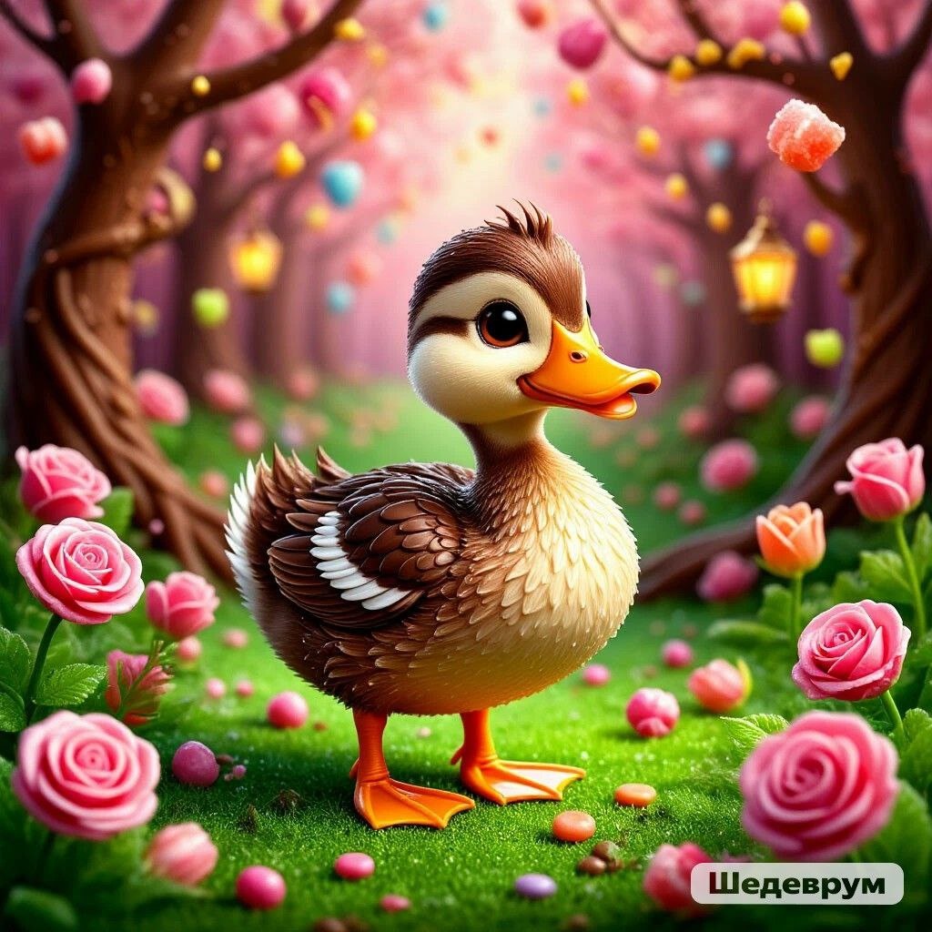 В самой сердцевине Сахарного Леса, где конфетные дожди плясали в вальсе с шоколадными вихрями, жила уточка по имени Кря. Необыкновенное это было место: вместо травы под ногами – хрустящая карамель, вместо кустов – сахарная вата, а вместо обычных цветов – леденцовые розы и желейные тюльпаны.