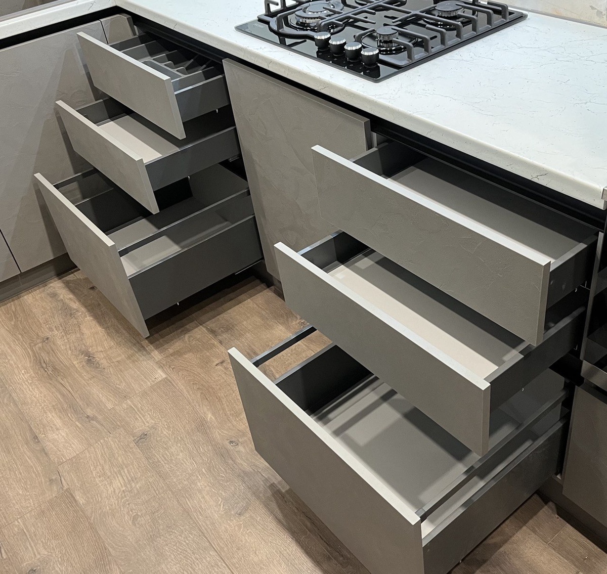 Кроме того, я не советую ставить push-to-open на нижние базы. Они ближе к ногам, и любое случайное касание приводит к открыванию фасада. Сначала кажется: «Ну и что?». А потом начинаешь уставать от постоянных приоткрытых дверок — и кухня перестаёт радовать.