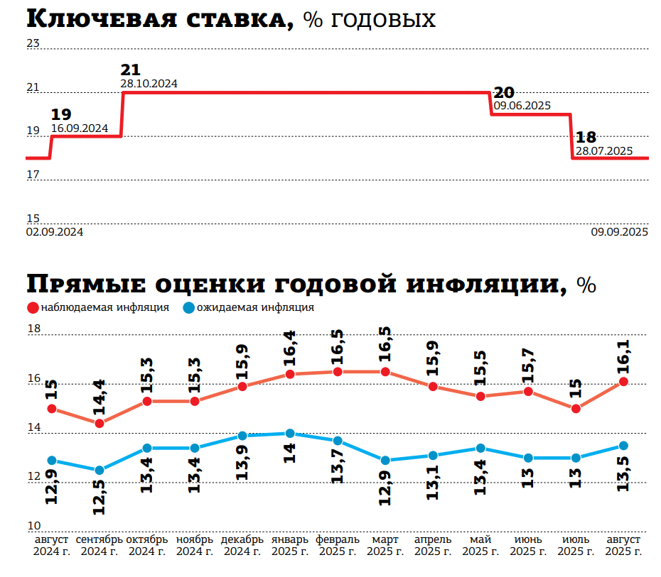 Удерживать ЦБ от более решительных шагов по ключевой могут высокие инфляционные ожидания (13,5% на август) и жёсткий рынок труда (безработица остаётся на минимальных 2,2%), а также неопределённость обновлённых параметров федерального бюджета, который может повлиять на баланс инфляционных рисков. "По этим причинам нельзя исключать осторожный шаг в 1 п. п., хотя снижение до 16% всё же выглядит более вероятным", — резюмирует Жорнист.