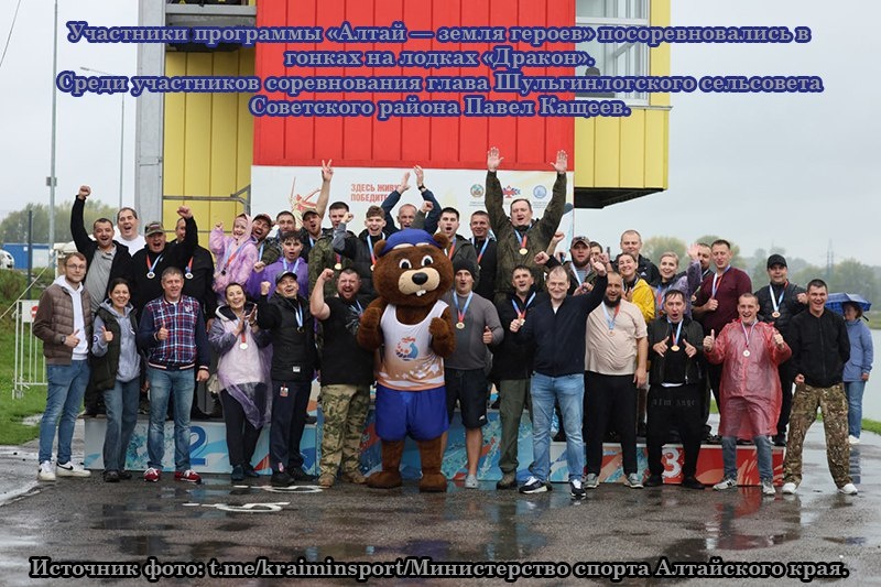 Участники программы «Алтай — земля героев» посоревновались в гонках на лодках «Дракон», как сказано в .Среди участников соревнования глава Шульгинлогского сельсовета Павел Кащеев. Павел Васильевич плыл в лодке под номером 2 — в лодке победителей.Даже ненастная погода не помешала участникам выйти на воду. К ним присоединились и члены семей.Сначала они провели тренировку под руководством опытных наставников. А затем три команды соперничали в скорости на 200-метровой дистанции. Лучшая команда шла в лодке под номером 2 и показала результат 1 минута 7,78 секунды.Кроме того, спортсмены выразили желание собрать собственный коллектив для участия в региональных соревнованиях.Также во время праздника для детей была подготовлена интерактивная программа: настольные игры и площадка-аквагрим. А перед этим для участник...