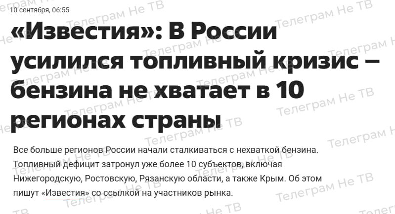 «Известия» нам сообщают что нашей стране усилился топливный кризис – бензина не хватает в 10 регионах страны "В качестве причины эксперты называют сезонное повышение спроса на топливо и рост активности туризма." Вот ответьте на вопрос за кого они нас считают? За животных которые смотрят постоянно на новые ворота? Потому что, только они могут не понимать что происходит. И верить в сказки про сезонный спрос и тем более про выросший туризм. Почему-то в прошлом году, в это самое время не было подобных проблем. А наверное туризма не было и сезонного спроса. Впрочем, о чем тут говорить. Какая власть, такие и «эксперты». На самом деле причина одна. Это движуха. И больше причин нет. Все остальное просто следствие происходящего. Как и большие объёмы этого самого топливо, которые оправляются сами понимаете куда. Так и обломки опасные, которые постоянно падают на наши НПЗ и склады топлива. Сколько их горело за последний год? Но, нам пытаются рассказать что во всем виноваты туристы. Это в очередн