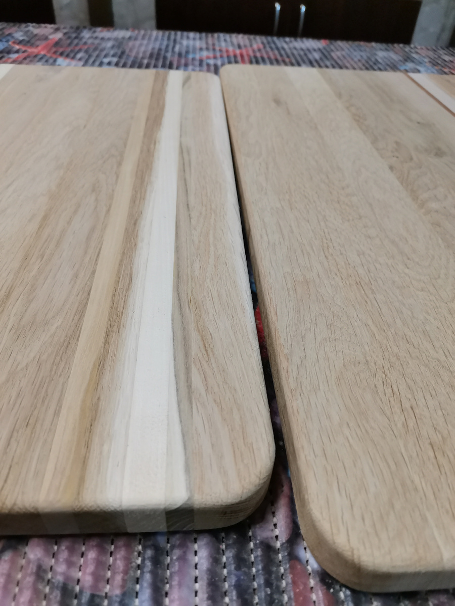 Да, всё намного проще, чем казалось. Я не сильный спец по разделочным доскам, так, побочный продукт, по мере накопления подходящих обрезков дерева. Для дома делал простые доски из ёлки, хоть они и быстро изнашиваются, но такого материала в остатке много и сделать новые не сложно. Тем более, периодическая замена старых досок, порезанных, с микробами, на новые приносит только плюсы. Об этом была статья, кому интересно, посмотрите. А вот в этой статье сам же себя немного опровергаю. Речь о поднятом ворсе. Только что сделанная доска, отшлифованная, покрытая маслом, воском. Приятно в руках держать. Хоть с ёлки, хоть из дуба. Не, с дуба, конечно, приятнее. Дубовые простые доски начал делать относительно недавно, ранее все остатки дуба были нужны для других целей, не так и много их оставалось. Но, время идёт, работа кипит, обрезки копятся, пришло время. Хотя торцевые доски и из дуба и из ясеня делал и ранее. В общем, после первой же мойки на кухне доска становится шершавой, поднимается ворс.