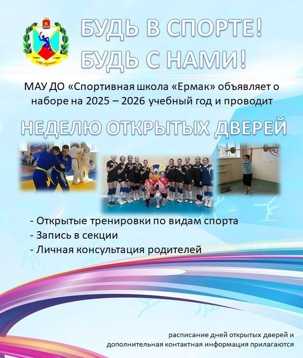 День открытых дверей в спортивной школе "Ермак"! Не знаете, куда отдать ребенка заниматься спортом? Не можете выбрать вид спорта? Тогда приходите к нам! БУДЬ В СПОРТЕ! БУДЬ С НАМИ! Объявляем набор обучающихся по различным видам спорта и приглашаем на Дни открытых дверей! С 25 августа по 15 сентября ждём детей и родителей на открытые тренировки и знакомства с нашими тренерами. Что вас ждёт: Открытые тренировки по различным дисциплинам Возможность записать ребёнка в интересующую спортивную секцию Индивидуальные консультации с тренерами-преподавателями Вся подробная информация о времени, дате и месте проведения Дней открытых дверей, а также о дополнительном наборе на учебный год 2025-2026 будет представлена на мероприятиях. Приходи, выбирай спорт по душе и начинай свой путь к спортивным вершинам вместе со спортивной школой "Ермак"! #спорт@glavachus #спорт@glavachus #спорт@glavachus