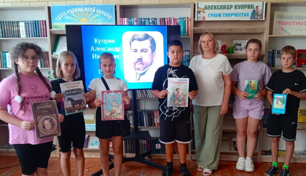 К юбилею писателя в Краснополянском отделе МБУК ПР «МЦБ» состоялся литературный вечер «Этот загадочный Куприн» для обучающихся ДШИ художественного отделения. Библиотекарь с помощью видеопрезентации «Благодарный обожатель жизни» познакомила присутствующих с биографией писателя и рассказала, что среди его произведений более 20 рассказов, написанных для детей. Это «Белый пудель», «Чудесный доктор», «Ю-ю», «Слон», «Изумруд» и другие. По названиям рассказов видно, что их героями являются животные. Затем ребята прочитали отрывки из произведений Александра Куприна, отвечали на вопросы тематической викторины, демонстрируя свои знания и интерес к литературе. У книжной выставки «Александр Куприн: грани творчества» прошёл обзор литературы.