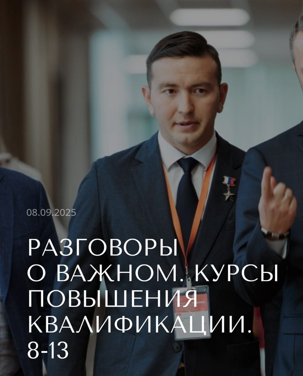 📢С 8 по 13 сентября 2025 года в Москве проходят курсы по дополнительной профессиональной программе «Тьюторское сопровождение специалистов, осуществляющих реализацию курса внеурочной деятельности «Разговоры о важном». На мероприятии собрались представители Министерства, региональных институтов развития образования, центров непрерывного повышения квалификации педагогических кадров, заместители директора по воспитательной работе. Адыгею представляет делегация: - Наталья Елистархова — ведущий консультант отдела развития общего образования, реализации региональных и этнокультурных особенностей Министерства образования и науки РА - Жанна Шорова — заместитель директора по научно-методической и воспитательной работе ГБУ ДПО РА АРИПК - Олег Казаков — методист ЦНППМПР - Ирина Титеева — заместитель директора по воспитательной работе МБОУ СОШ №8 Кошехабльского района. Участники курсов повышения квалификации принимают участие в очных занятиях, включая лекции, панельные дискуссии и практические