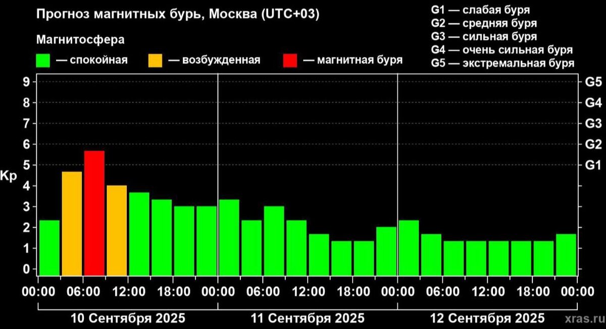 Она начала бушевать еще с ночи и достигла пика утром в среду. Интенсивность составляет почти 6 баллов из 10, что может быть вполне ощутимо и проявляться в виде слабости, головной боли, раздражительности.