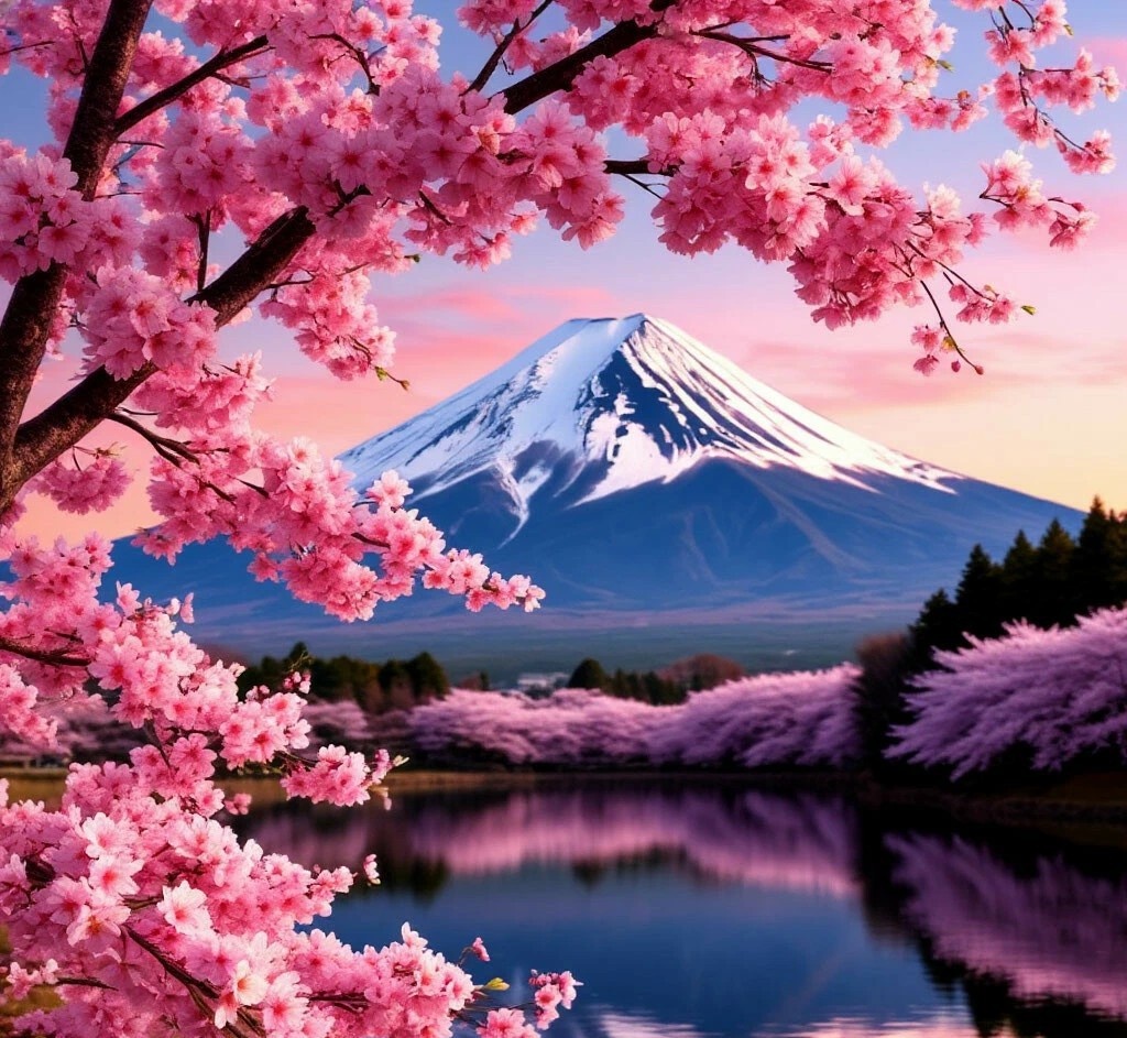 Графика 3D, лепестки сакуры, ветки сакуры. Визуальная необычная красота, нежность, детализация, профессиональное фото, блеск, Гора Фудзияма,РАССВЕТ,