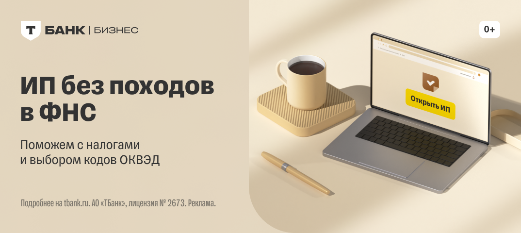 Мы стали партнерами Т-Банка — экосистемы банковских продуктов для предпринимателей и компаний. Поможем зарегистрировать ИП или ООО, открыть расчетный счет, подключить прием платежей и использовать другие инструменты для решения бизнес-задач. Вот какие продукты можно подключить с нашей помощью. Регистрация ИП или ООО с одним учредителем — без уплаты госпошлины и скрытых платежей, без посещения налоговой. Можно получить консультацию по выбору кодов ОКВЭД и системы налогообложения. Расчетный счет в Т-Банке для ИП и компаний, чтобы принимать и отправлять платежи и рассчитываться с контрагентами. Открытие бесплатно за один день, без поездок в банк и очередей. Обслуживание первые 2 месяца бесплатно с любым тарифом, после — от 490 ₽ в месяц. Можно оплатить тариф на год по цене десяти месяцев: так вы сэкономите стоимость еще двух месяцев обслуживания. Зарплатный проект и выплаты самозанятым — для расчетов с сотрудниками. Торговый эквайринг — для приема безналичных платежей в точках продаж. И