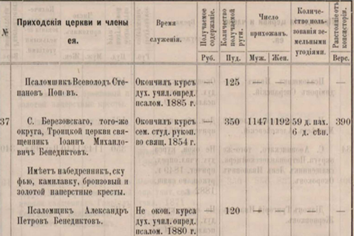 1880–1883 — священник Павел Красноцветов, псаломщик Александр Бенедиктов. Александр Петрович Бенедиктов не завершил обучение в духовном училище и в 1880 году был определен псаломщиком в церковь с. Березовского.