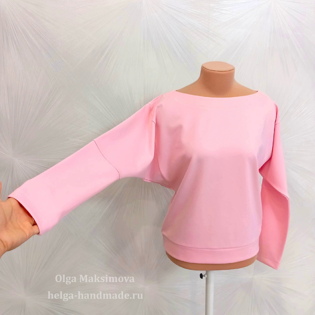 В данной статье покажу, как сшить джемпер среднего объема со спущенной линией плеча. Горловина формы «лодочка», рукава кроя «летучая мышь». На 44 размер и рост 164 см у меня ушло 110 см трикотажа джерси при ширине 155 см. Цвет светло-розовый. Шила по выкройке с сайта Шкатулка (размеры 40-64). В выкройке ничего не меняла. Итак, кроим детали выкройки. Не забываем перенести метки. Перед, спинка, верхняя и нижняя части рукавов по 2 шт в зеркальном отражении, притачной пояс, обтачка горловины переда и спинки. Перед и спинку кладем друг на друга лицом к лицу и стачиваем плечевые швы, где отмечено клипсами для фиксации ткани. Припуски заутюживаем на сторону переда. Детали обтачки дублируем, то есть с изнаночной стороны проклеиваем трикотажным дублерином. Стачиваем плечевые срезы обтачек, где отмечено клипсами. Внешний срез обметываем на оверлоке. Кладем обтачку на горловину изделия лицом к лицу и стачиваем. Припуск шва обтачивания горловины отворачиваем в сторону обтачки и отстрачиваем по лиц