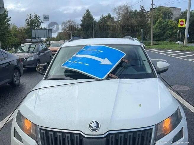 😳 Дорожный знак упал на машину на перекрестке Чайковского и Куйбышева в Челябинске