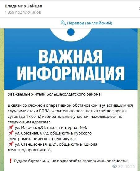 Глава Большесолдатского района дал рекомендации по посещению избирательных участков из-за участившихся атак БПЛА. - В связи со сложной оперативной обстановкой и участившимися случаями атак БПЛА желательно посещать в светлое время суток (до 17:00) избирательные участки, - пишет Зайцев в своем тг-канале. - Будьте бдительны, не подвергайте свою жизнь опасности!