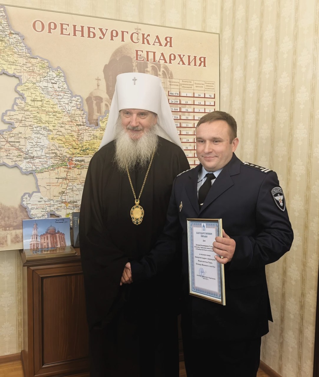 10 сентября в здании Оренбургского епархиального управления митрополит Петр встретился с начальником Управления специальной связи по Оренбургской области, полковником Дмитрием Владимировичем Гуляевым. Владыка поблагодарил Дмитрия Владимировича за оказанную помощь в сопровождении ковчега с мощами святителя Тихона, вручил благодарственное письмо и выразил надежду на дальнейшее сотрудничество. На память о встрече митрополит Петр подарил полковнику икону новопрославленного Оренбургского святого преподобного Зосимы, книгу "Православные исторические храмы Оренбуржья и свежие номера официального епархиального журнала "Ведомости Оренбургской митрополии".