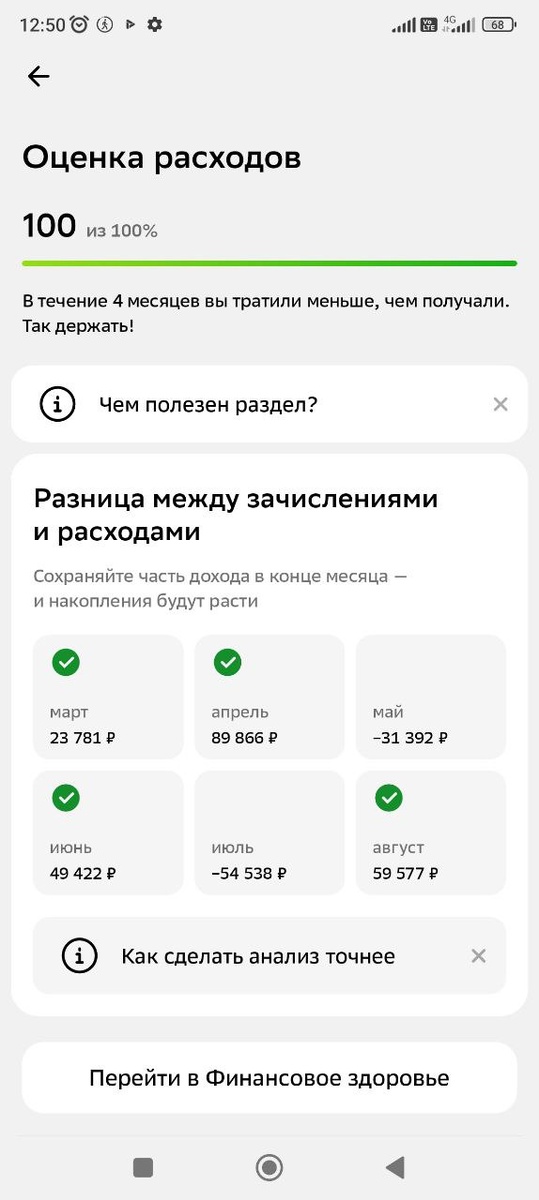 А ещё меня похвалил Сбер, за то, что на протяжении четырех месяцев мои расходы не превышали доходы