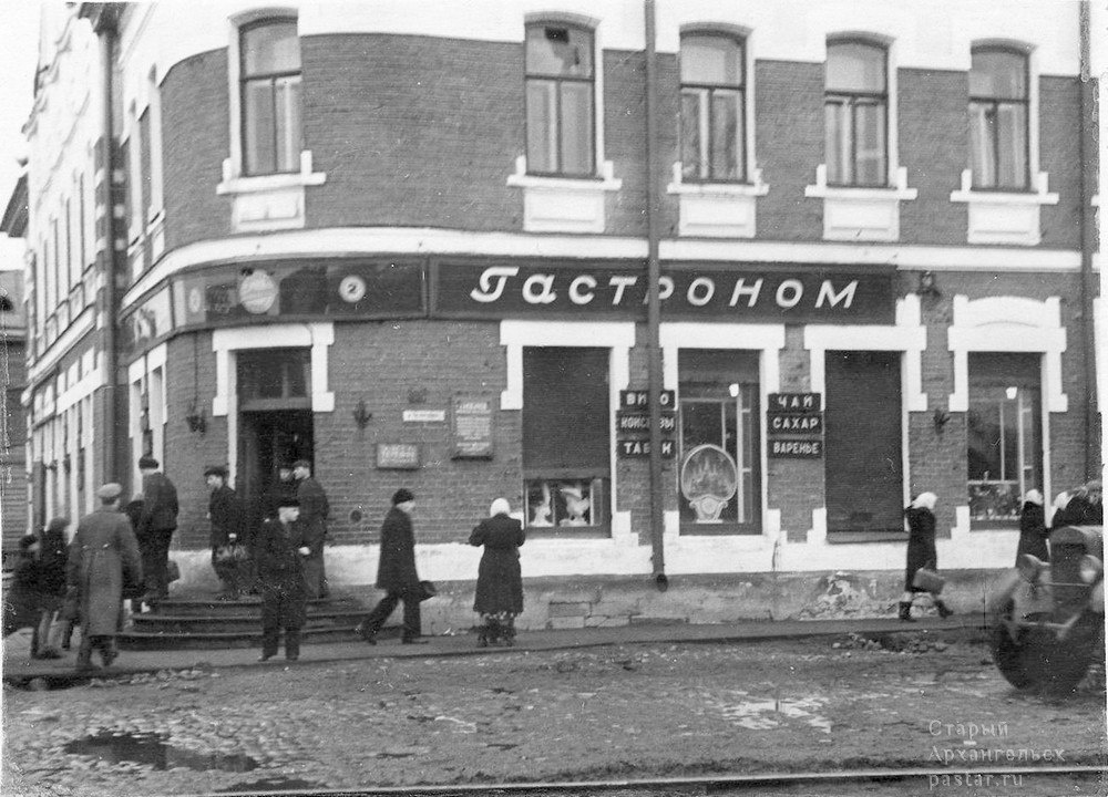 Гастроном в Соломбале. Справа видна передняя часть автомобиля. Это может быть ЗИС-5 или его предшественник АМО-3. В любом случае, эти грузовики начали производить в 1930-х годах. Дорога ещё из брусчатки. Подробнее по ссылке: https://pastar.ru/index.php?option=com_content&view=article&id=7890:gastronom-v-solombale&catid=97&Itemid=105&utm_source=tg&from=gastronom-v-solombale #СтарыйАрхангельск #Соломбала #Никольский_Левачева #Терехина #Архангельск