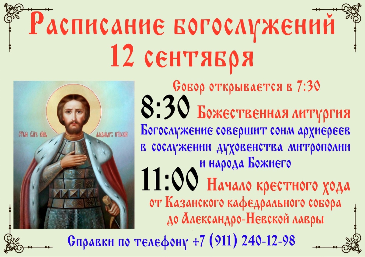 12 сентября 2025 года пройдут торжества в честь перенесения мощей святого благоверного великого князя Александра Невского из Владимира в Санкт- Петербург. По благословению митрополита Санкт-Петербургского и Ладожского Варсонофия состоится традиционный праздничный общегородской крестный ход по Невскому проспекту от Казанского кафедрального собора до площади Александра Невского. Приглашаем принять участие в крестном ходе в честь небесного покровителя Санкт-Петербурга, святого благоверного князя Александра Невского. Начало Божественной литургии в Казанском кафедральном соборе 12 сентября в 8:30, которую совершит сонм архиереев в сослужении духовенства митрополии и народа Божиего. Начало крестного хода в 11 часов.