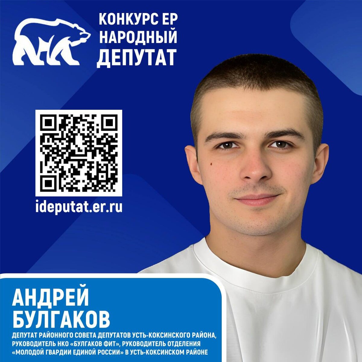 🇷🇺 Продолжаем знакомство с кандидатами конкурса «Народный депутат» Сегодня рассказываем об Андрее Булгакове — депутате Совета депутатов МО «Усть-Коксинский район» от избирательного округа № 5, руководитель местного отделения Молодой гвардии «Единой России». Андрей Андреевич родился 8 января 1997 года в селе Усть-Кокса. Окончил АлтГУ по специальности «Зарубежное регионоведение», имеет дополнительное образование в сфере фитнеса. Ключевые достижения за три года депутатской деятельности: 🔹Сохранение детского лагеря «Беловодье»; 🔹Организация финансирования спортивных мероприятий; 🔹Привлечение молодежи к здоровому образу жизни; 🔹Работа над созданием Центра патриотического воспитания молодежи. Андрей Булгаков о своей работе: «Депутат — это возможность что-то изменить, помочь людям решить их насущные проблемы. Я верю, что вместе мы сможем продолжать делать наш район местом, где каждому будет уютно и где каждый сможет реализовать свои мечты». Андрей считает самой эффективной практи
