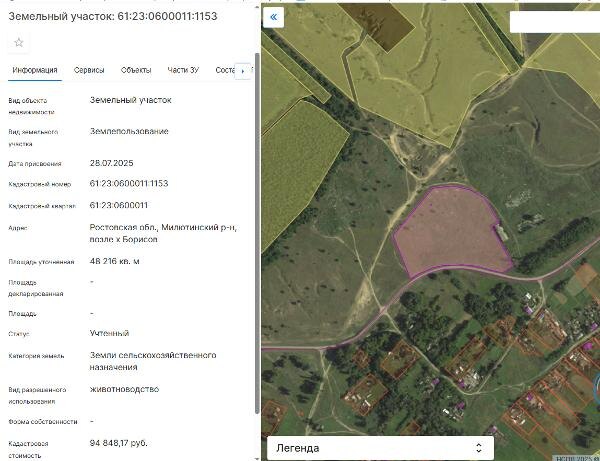 Название: Лот № 1: аренда земельного участка, государственная собственность на который не разграничена, расположенного по адресу: Российская Федерация, Ростовская обл., Милютинский р-н, возле х Борисов, площадью 48216 кв.м, категория земель – земли сельскохозяйственного назначения, разрешенное использование: животноводство, с кадастровым номером 61:23:0600011:1153, сроком на 3 года. Канал: Госземля Ростовская область Область: обл Ростовская Российская Федерация Район: Ростовская обл. Населенный пункт: Милютинский р-н, возле х Борисов. Локация: Смотреть на карте ВРИ: Животноводство Кадастровый номер: 61:23:0600011:1153 Кадастровая стоимость: 94848.17 Вид сделки: Аренда Площадь: 48216 м² Начальная цена: 12500.00 руб. Дата завершения: 25.09.2025 Подробнее: ГИС ТОРГИ #госземля #земляотгосударства #земля #земельныйучасток #земельныеторги #торги #аукцион #арендаземли #аренда #ростовскаяобласть