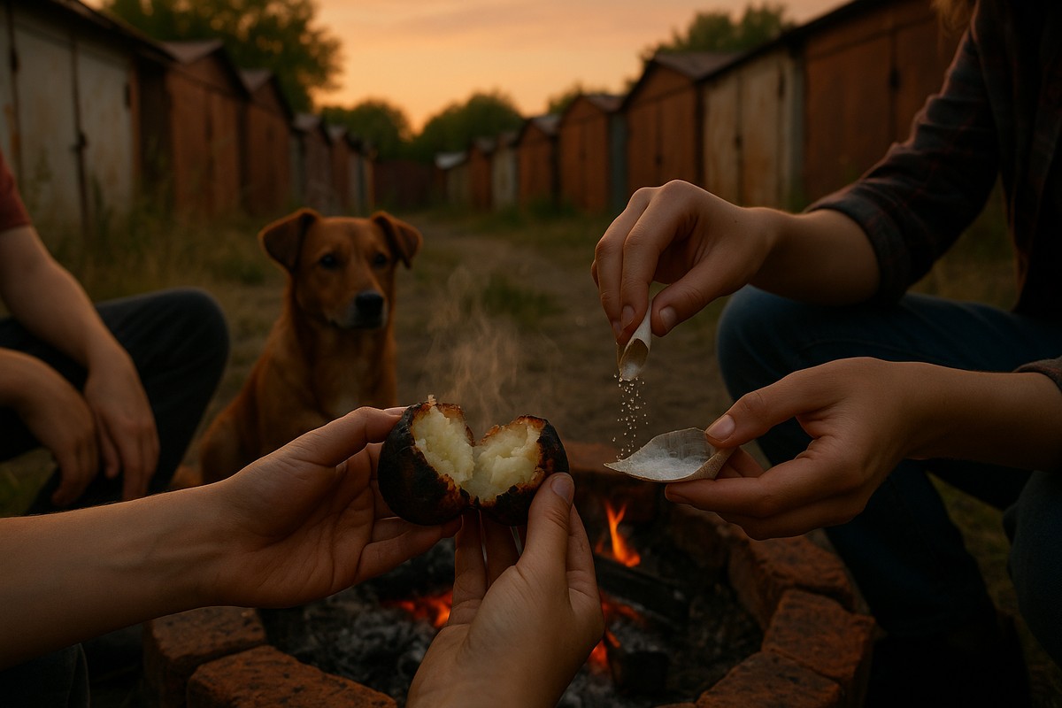 Это воспоминание — как ключ от старого домофона: нажми — и в памяти щёлкнет, заскрипит пружина, и обнаружится знакомый двор, закатное небо цвета осеннего яблока, и те самые ржавые кооперативные гаражи, что стояли, как крепостная стена. Между ними — просвет, бурьян, лопухи и круглая коптящая обугленная чаша костра, сложенная из кирпичей. Мы сидели вокруг, пригибаясь к жару, и держали веточки наготове, чтобы потом достать шипящие чёрные шарики картофеля из угля. Пахло дымом, неповторимым ароматом и свободой, от которой горели щёки.