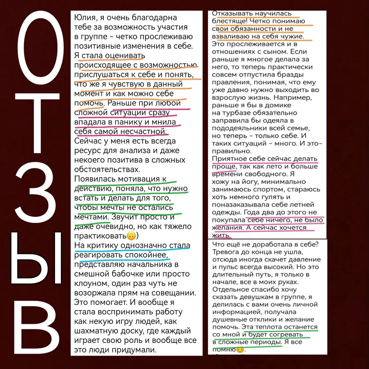 ♥️♥️♥️♥️ Итак, друзья, я делилась отзывами участниц прошлой группы, делилась своими результатами, пришло время поделиться кейсом одной из участниц прошлой терапевтической группы Самоценность. ♥️ Точка А участницы: - отсутствие контакта с собой - жертвенность - тревожность, страхи, панические атаки - болезненное реагирование на критику - не умение отказать - сложности с отстаиванием личных границ - постоянно все контролировала - забыла про свои цели и желания - забыла как это радовать себя ♥️ Точка Б к концу терапевтической группы: - прислушивается к себе - следует за своими мечтами - спокойная реакция на критику - научилась говорить "Нет" - научилась отставать личные границы - снижение контроля и тревожности - снова себя радует 💙 Друзья, ну как вам? Крутые же результаты? Хотите также? У вас есть такая возможность в моей новой терапевтической группе Самоценность, записаться ♥️ @sorokina_juliya ♥️♥️♥️♥️♥️♥️