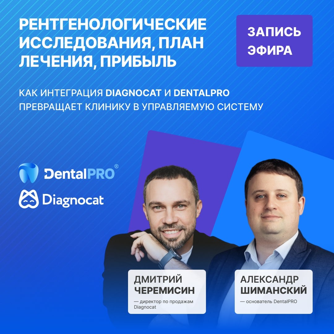 ⚡️Не пропустите полезный контент: в сети появилась запись совместного вебинара МИС DentalPRO 🦷 и компании Diagnocat. В прямом эфире зрители узнали, как интеграция Diagnocat и DentalPRO превращает клинику в управляемую систему🚀 🙎♂️Александр Шиманский, основатель DentalPRO, и Дмитрий Черемисин, директор по продажам Diagnocat, рассказали: ✏️ Почему ИИ видит то, что пропускает опытный врач? ✏️ Почему пациенты уходят после первичной консультации и как это исправить? ✏️ Как превратить данные из рентгеновских снимков в прибыль, а не просто архив? ⛓️💥Запись вебинара доступна на ведущих площадках: 😄VK 🥰RuTube 😌Не забудьте подписаться на наш телеграм-канал, чтобы не пропустить следующие вебинары📹 До встречи в эфире!😀 #Вебинары