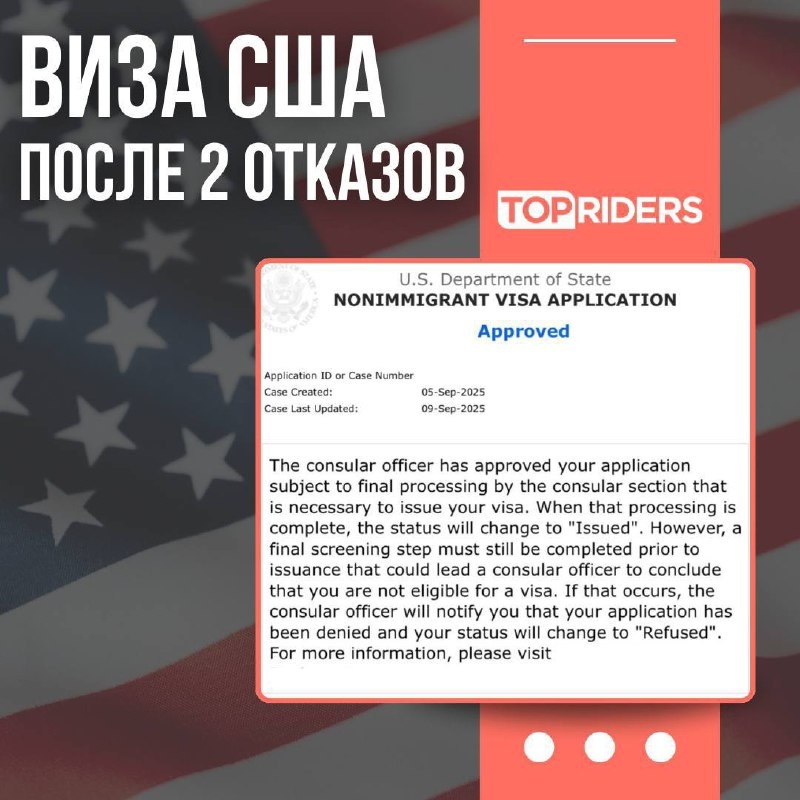 Виза США после 2 отказов 🇺🇸 9 сентября: одобрение первичной туристической визы США гражданке РФ после 2 отказов. Собеседование было назначено до недавних изменений и проходило в Европе. Кейс: женщина, состоит в гражданском браке. Клиент является владелицей магазина оптики. В Америке находится дочь в статус political asylum, в ожидании Green Card. За последние 5 лет было посещено 4 страны. Собеседование проходило с переводчиком. Вопросы консула: - Где вы работаете? - У вас есть дом или квартира? - К кому вы едете? - У дочки есть гражданство Америки? - Когда вы хотите ехать? После ответов на вопросы консул одобрил долгожданную визу! 🇺🇸 Этот пример подтверждает: есть страны, где сохраняются записи на собеседования, а главное - ставят одобрения! ✅ Мы также открывали Клиенту визу шенген для прохождения собеседования в Европе. Получить визу США ⬅️ Записаться на консультацию ⬅️ #кейс #виза_сша #виза_после_отказа