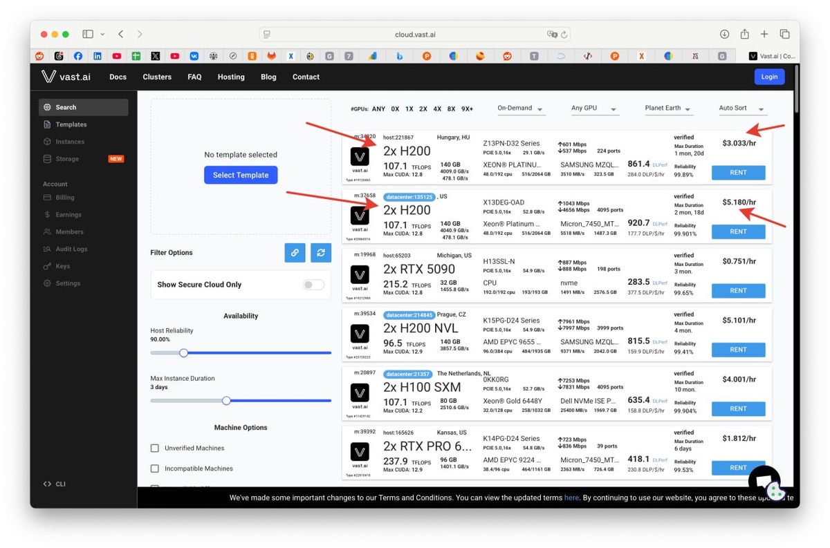Одна из самых больших площадок по аренде GPU. На картинке подсветил - vast.ai. За 5$ в час получите монстра с 2 картами H200. А если готовы платить 9$ в час, то будет 2x B200. Про H200 читал, а вот B200 (180 гб памяти) - вообще кракен в мире железа для ИИ :) По данным MLPerf v4.1 и обзоров, B200 даёт кратный прирост: на крупных LLM‑задачах вроде GPT‑3 предобучения и LLaMA fine‑tuning ускорение составляет примерно 2 раза на GPU против H200/H100‑систем... 5$ в час = 870$ в меся или около 74 000 р. Не так уж и дорого, если у вас соответствующие задачи по требованиям к скорости. Например, около 1.2–1.8 тыс токенов в секунду можно выжимать для ИИ oss-120b на такой сборке. Это около 5000 символов русского языка в 1 секунду в генерации. p.s. 5$ в час = 720 * 5 = ±3200$ я ошибся в оценке затрат, сорри. Цифра уже не выглядит вкусной :) Русский ИТ бизнес