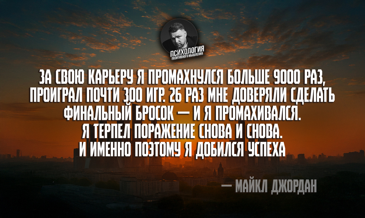 За свою карьеру я промахнулся больше 9000 раз, проиграл почти 300 игр. 26 раз мне доверяли сделать финальный бросок — и я промахивался. Я те