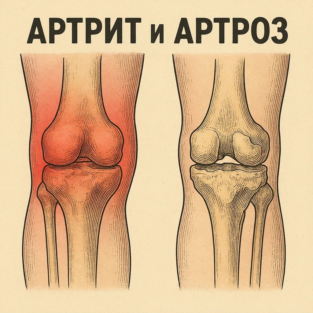 КАК ОТЛИЧИТЬ АРТРИТ ОТ АРТРОЗА 🔥 Артрит — воспаление сустава — боль чаще ночью и в покое — выраженная утренняя скованность — кожа вокруг сустава может быть красной и горячей 👉 развивается быстро, часто после инфекции или сбоя иммунитета ⚙️ Артроз — постепенное разрушение хряща — боль усиливается при нагрузке и к вечеру — хруст и ограничение движений — суставы деформируются со временем 👉 прогрессирует медленно, связан с возрастом, травмами, нагрузкой 💡Главное различие: Артрит — воспаление, боль в покое и ночью Артроз — износ, боль при движении и нагрузке