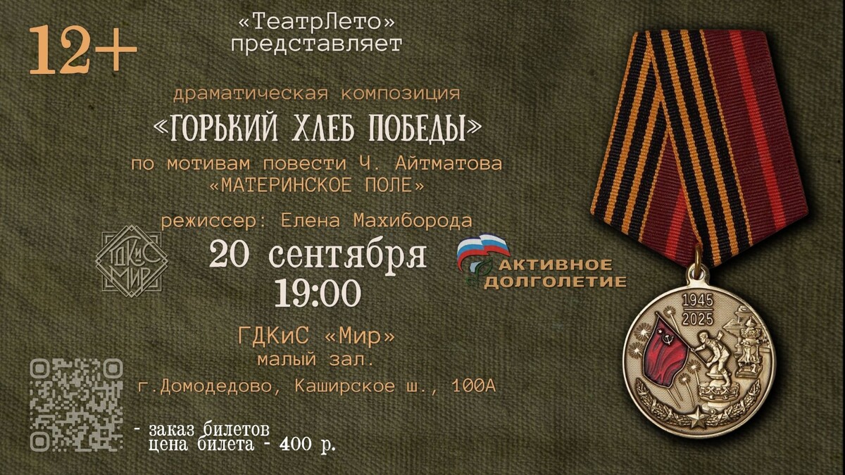 ✨ 20 сентября 2025 года приглашаем на спектакль! "ТеатрЛето", коллектив-спутник театра «Мельпомена» представляет спектакль "Горький хлеб Победы". Режиссер Елена Махиборода. Спектакль "Горький хлеб Победы" создан по мотивам повести Чингиза Айтматова "Материнское поле". Это рассказ о женских судьбах в годы Великой Отечественной войны - тружениках тыла, матерях и женах, которые ждут возвращения своих близких. И всеми силами помогают приближению Победы. 🚫 Возраст: 12+ 📆 20.09.2025🕒19:00 🏢 Дворец культуры и спорта «Мир» 📍 г. Домодедово, Каширское шоссе, д.100А 💰 Цена: 400 ₽ ✅ Мероприятия Домодедово https://dzen.ru/id/66f10385cc4c5a16f7b5fb02 http://vk.com/domodedovo_events http://dzen.ru/domodedovo_events