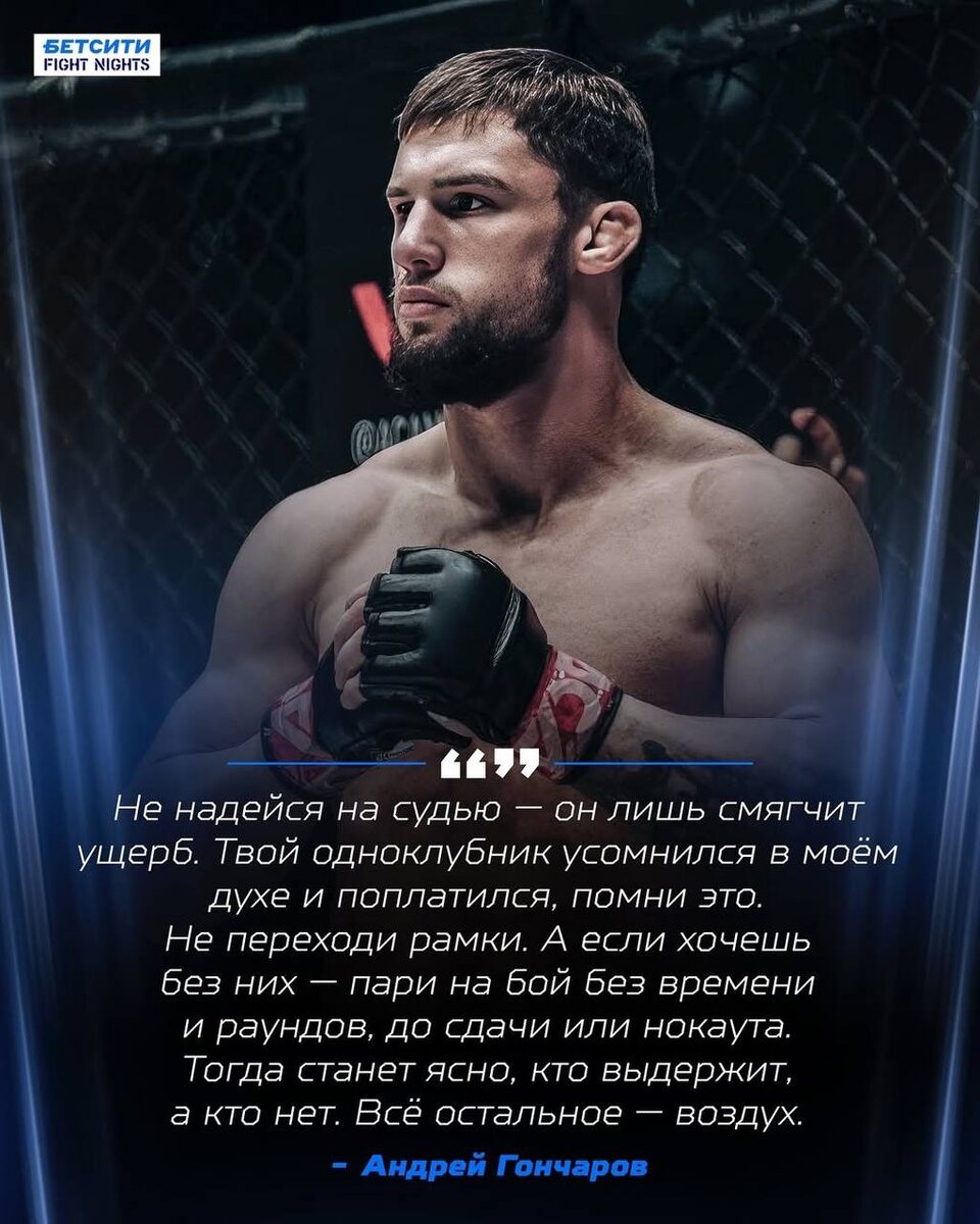 “Твой одноклубник усомнился в моем духе и поплатился”: Гончаров и Ашаханов устроили качественный трэш-ток перед боем на Бетсити Fight Nights 128 Кажется, в со-главном событии турнира нас ждет довольно личная история между Андреем Царь-пушкой Гончаровым и Тамерланом Ашахановым. Ребята сказали много слов, но уже 14 сентября в прямом эфире телеканала UDAR выяснят, кто же лучше в клетке. ™️Смотри Бетсити Fight Nights 128 уже 14 сентября в 18:00 Мск в прямом эфире телеканала UDAR в VK Видео или по ссылке – taplink.cc/udar.tv