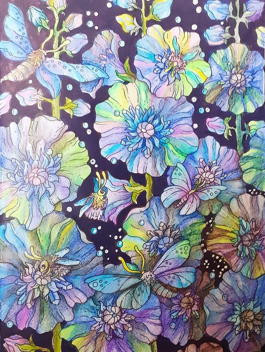 Сейчас раскрашиваю сильно меньше. Переключилась на коллаж. Мне нравится менять изобразительные медиумы. Нравится, как цветные карандаши шуршат по бумаге, как мягко и плавно ложится гуашь, и раскраски позволяют играть с этими безобидными творческими действиями. Цветы и бабочки из раскраски Ханны Карлсон "Магический дом". На фоне использовала акриловые маркеры, всё остальное - цветные карандаши Малевич. Фонарь гуашью, книжка та же: Обычно в своих рисунках желтый не использую. А вот раскраски - то место, где можно всё, что не нравится обычно, попробовать. Понравился желтый тут. Хотя никто не запрещает сделать фонарь и с голубоватым, и с фиолетовым свечением. Но тогда контраста не получилось бы. Грибы: Городской пейзаж из раскраски "Магия городов": Желаю всем побольше ярких красок в жизни.
