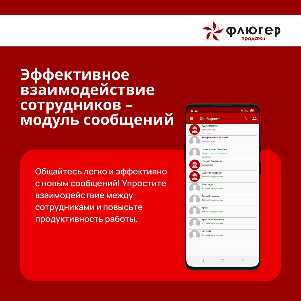 Система «Флюгер-Продажи» оснащена удобным встроенным модулем для обмена сообщениями, который позволяет сотрудникам оперативно общаться друг с другом прямо из интерфейса программы, не прибегая к использованию внешних мессенджеров или электронной почты.