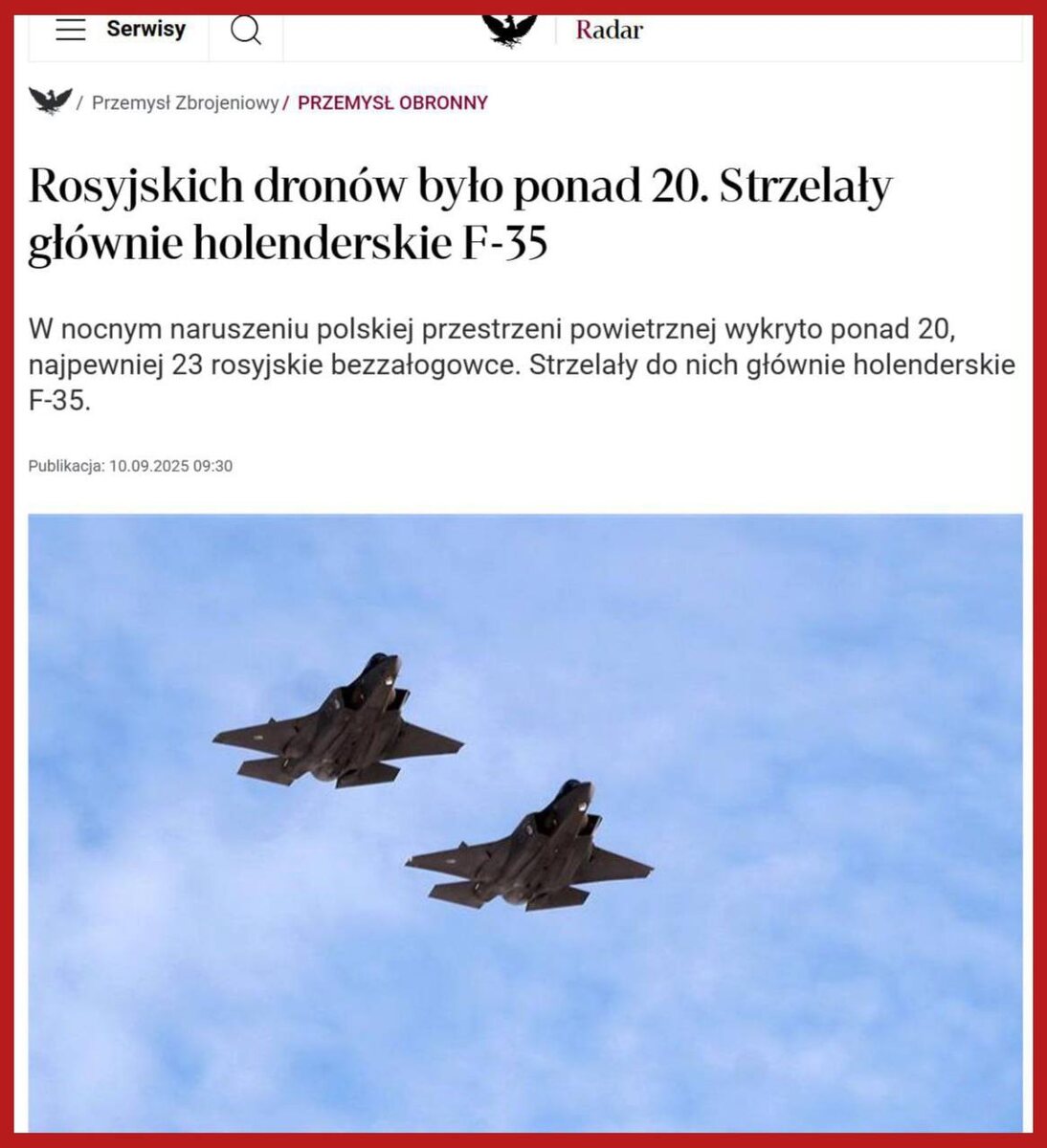 Для уничтожения БПЛА над Польшей были задействованы польские F-16, нидерландские F-35, итальянские разведчики AWACS и самолёты-заправщики НАТО, - Reuters