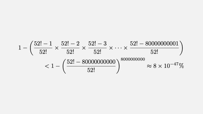 Если бы все 8 миллиардов человек на Земле перетасовали колоду карт, вероятность того, что любые две карты легли бы в одинаковом порядке