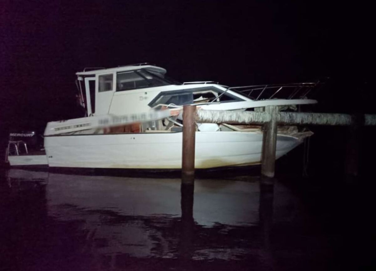 Катер врезался в конструкции старого причала в городе Наволоки. Так получилось, что конструкции причала находятся в 30-35 метрах от берега, а катер врезался в центр опор, из-за чего «нос» судна разрезало пополам.