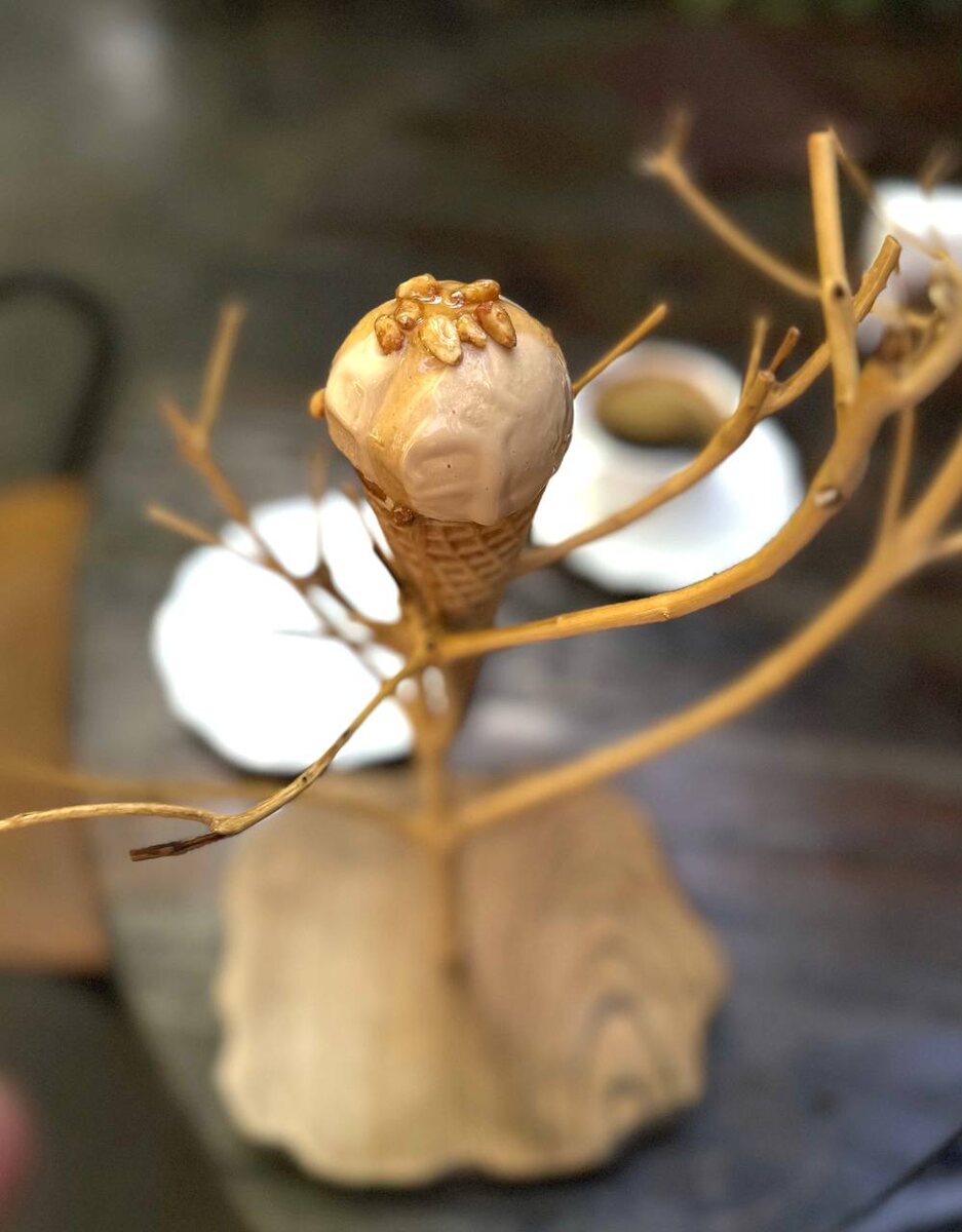 Самая необычная подача мороженого, которую видели. Рожок со вкусом ряженки с кедровым орехом спрятался среди веток деревьев – искать в Yauza.