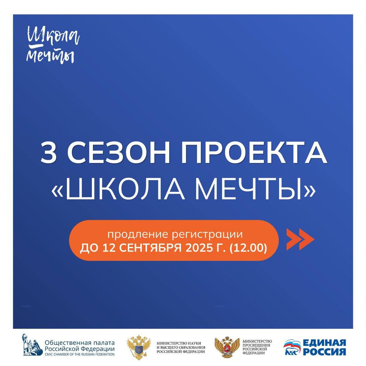 Ещё есть время присоединиться к 3-му сезону федерального проекта «Школа мечты»! Сроки регистрации для участия продлили до 12 сентября, 12:00 по мск.