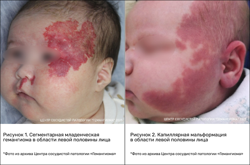 Капиллярные мальформации в течение жизни могут видоизменяться по цвету, толщине, но они не проходят. В отличие от них младенческая гемангиома — опухолевидный процесс, доброкачественная сосудистая опухоль, которая активно развивается, разрастается, но может и регрессировать. Это основные клинические признаки этих патологий.