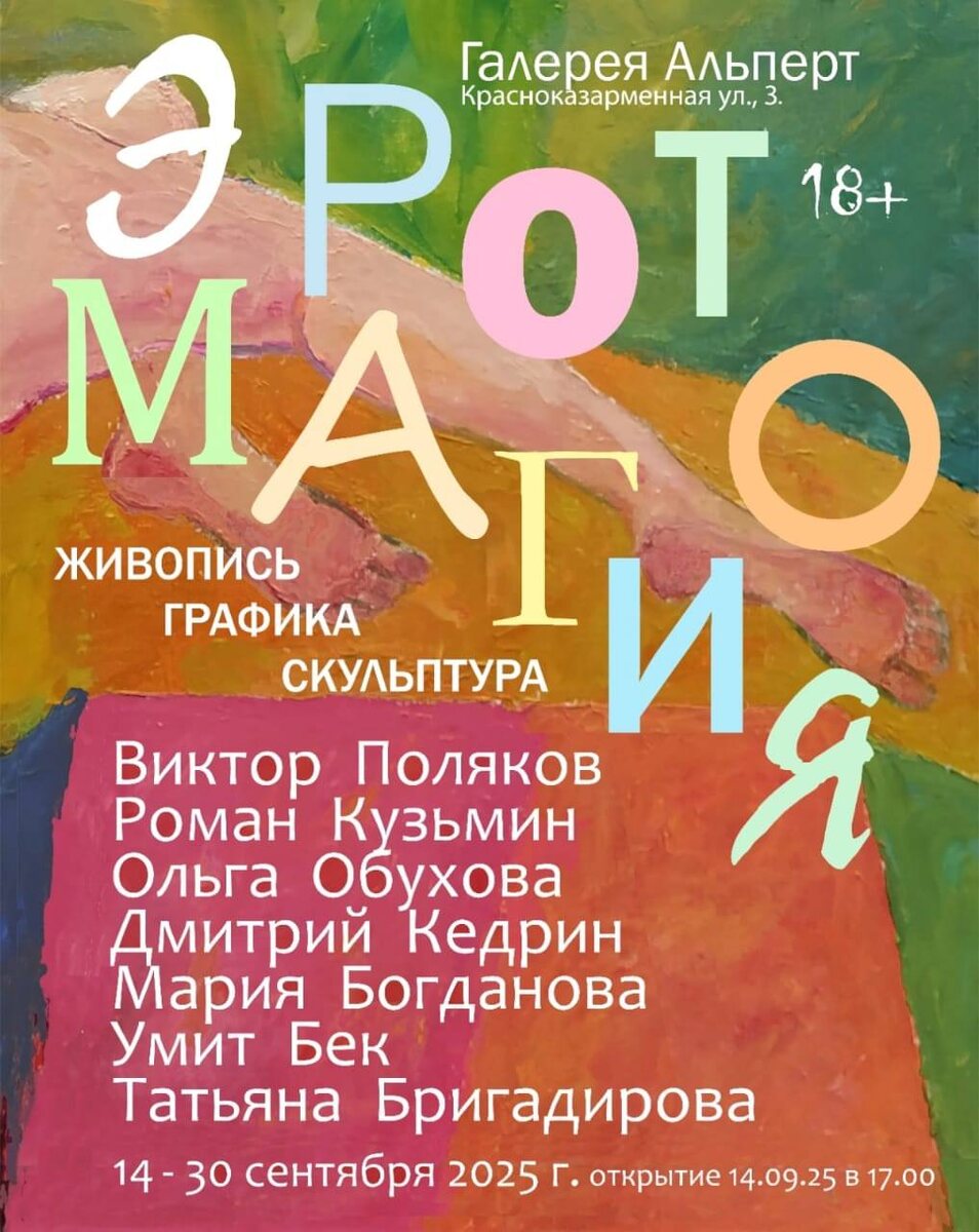 Внимание! Анонс! С 14 по 30 сентября 2025 года в галерее Альперт (ул. Красноказарменная, д.3) пройдет выставка "Эротомагия". На ней будут представлены живопись, скульптура и графика.