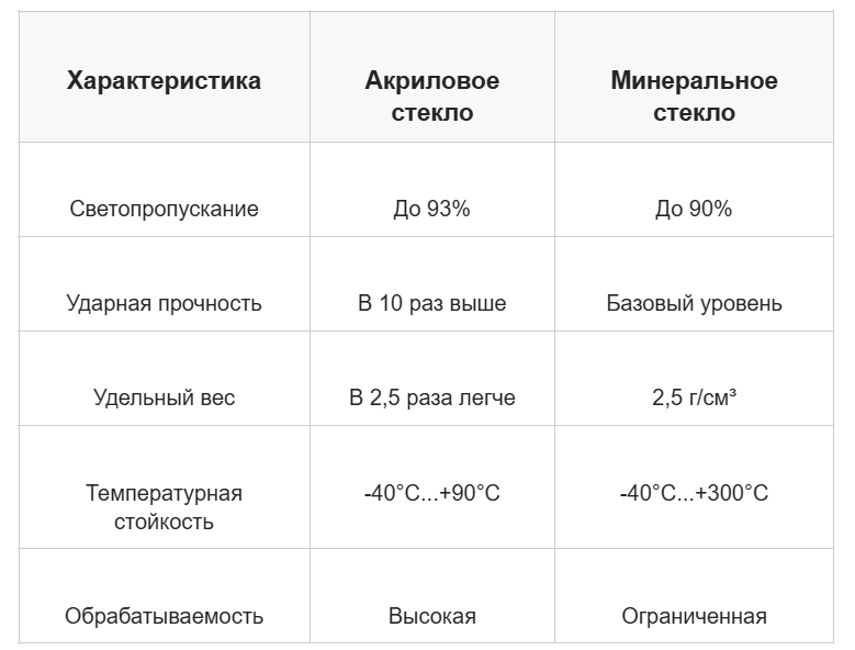 Превосходя минеральное стекло по ударопрочности в 10 раз при весе в 2,5 раза меньше, акриловое стекло стало основой для эффективных технических решений в различных отраслях промышленности, где требуется сочетание прозрачности, прочности и малого веса конструкций.