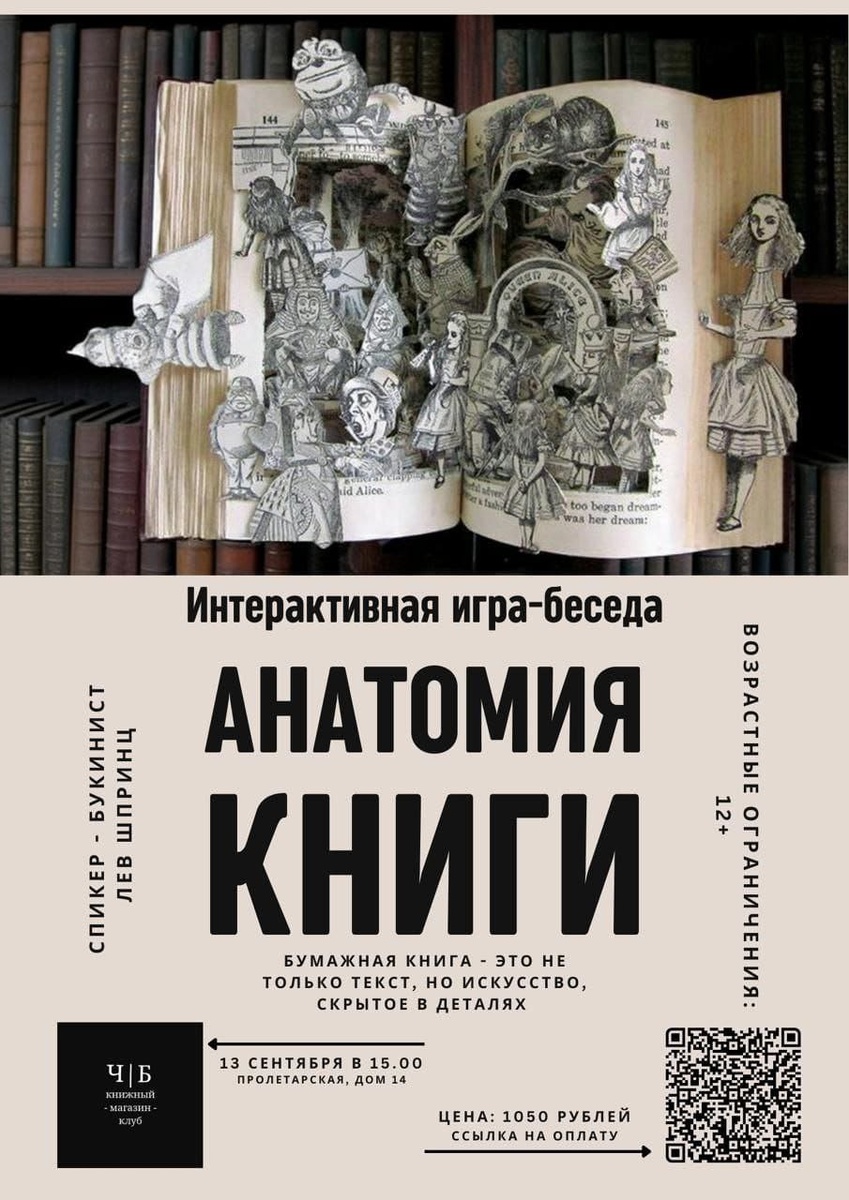 13 сентября в 15.00 в книжном магазине-клубе Ч|Б пройдёт интерактивная лекция "АНАТОМИЯ КНИГИ