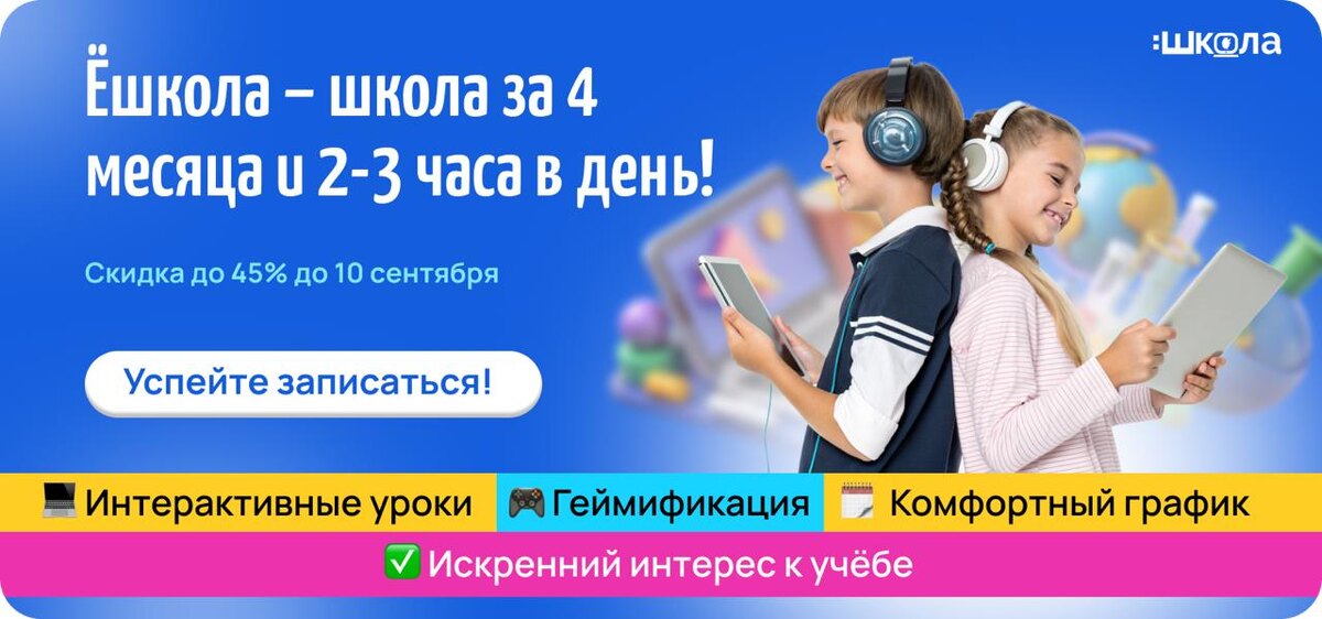 Пройдите школьную программу за 4 месяца. Знаете, в чем прелесть Ёшколы? Можно начать учиться даже в январе и успеть пройти школьную программу к маю. А если записаться в январский поток до 10 сентября, то можно сэкономить 45% от стоимости обучения! Это если очень коротко… А теперь полная версия. Мы тут делали внутреннее исследование разных программ для быстрого обучения. Хотели сравнить, есть ли что-то на рынке, чтобы пройти школьную программу быстро. И обнаружилась интересная вещь — у многих популярных онлайн-школ нет полноценной скоростной программы обучения. Либо это просто набор материалов для самостоятельной подготовки, состоящий из записей прошлых вебинаров, либо это обычные уроки по расписанию. А что делать тем, кому нужно пройти программу быстро? Например, если хочется пройти 2 или даже 3 класса за 1 год? Или тем, кто плотно занят в спорте/творчестве? Согласитесь, просто иметь набор материалов для самостоятельного обучения мало. Надо понимать, в каком порядке их изучать, к