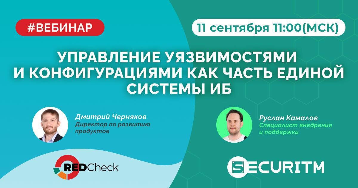 🔵🔵🔵🔵🔵 Больше чем VM: Управление уязвимостями, конфигурациями и политиками безопасности в единой системе. Как превратить информацию из сканера безопасности в реальные действия по защите вашей инфраструктуры? Мы предлагаем решение этой проблемы на вебинаре от RedCheck и SECURITM. На встрече мы разберем примеры из практики: 🔵Как выстроить комплексный процесс устранения уязвимостей по требованию регулятора. 🔵Получение актуальной информации об IT-активах для принятия решений. 🔵Настройка автоматизированных процессов для оперативного устранения наиболее критичных уязвимостей. 🔵Использование данных об уязвимостях для оценки рисков и прогнозирования возможных инцидентов. 🔵Объединение данных сканеров RedCheck с другими системами защиты для формирования единой картины ИБ ➡️ Регистрация #GDS #анонс